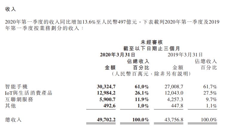 2020年第一季度,互联网服务收入达到人民币59亿元,同比增长38.6%,占总收入比达到11.9%。 互联网服务的用户活跃度和使用时长在2020年第一季度都明显增加。2020年3 月,MIUI月活跃用户数达到330.7百万,同比增长26.7%,其中,中国大陆地区的MIUI 月活跃用户数为111.5百万。 2020年第一季度,广告收入达到人民币27亿元,同比增长16.6%。