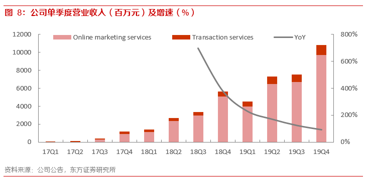 2019年底移动端月活用户数达4.82亿,同比增长77%,全年新增2.1亿,其中Q4新增5200万。在互联网流量红利末期,拼多多属于罕见地仍在高速扩张。
