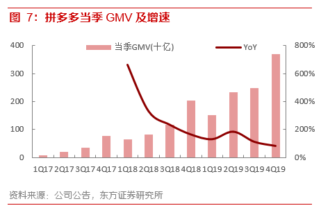 在用户数和人均GMV增长的驱动下,拼多多2019年全年实现GMV 1.0万亿,达成此前提出的小目标,同比增长113%,测算Q4单季实现GMV 3,710亿元,同比增长81%。