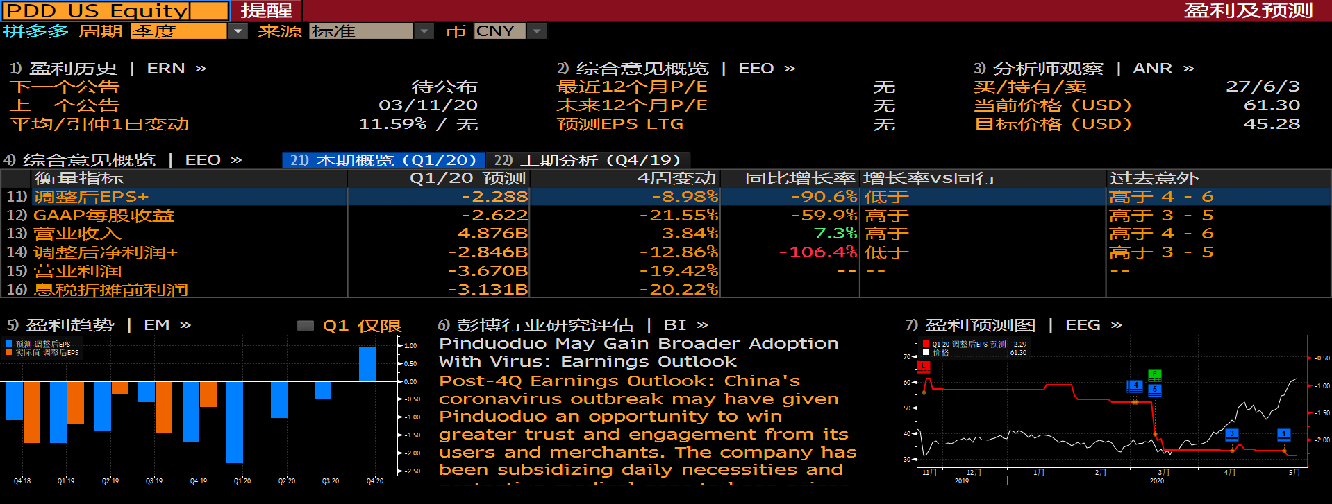 根据彭博的综合意见,市场目前一致预期拼多多一季度实现营收48.76亿元人民币,同比增长7.3%。经营亏损36.7亿元,调整后净亏损28.46亿元,同比亏损扩大106.4%,调整后每股亏损2.288元,同比扩大90.6%。一方面是由于物流暂停服务,或导致用户下单减少。一方面也是疫情期间拼多多对商户有较多的让利与补贴,直接伤害到收入和利润。
