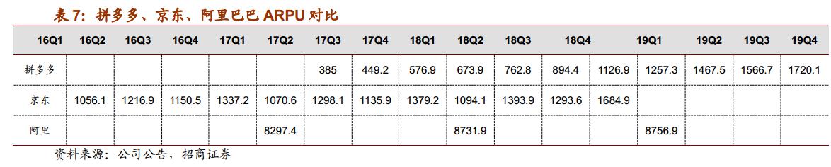 活跃消费者上,拼多多其实早就超过京东,数值已经庞大到接近6亿,增长较难出彩,如此一来GMV就是最大的看点,GMV=年度活跃买家数量×年度人均花费金额(ARPU),其增长更多要看ARPU提升,也就是客单价和单用户购买频次的上升。而拼多多最饱受诟病的便是单用户客单价一直远低于京东和淘宝,所以导致单用户的价值也一直不如京东。