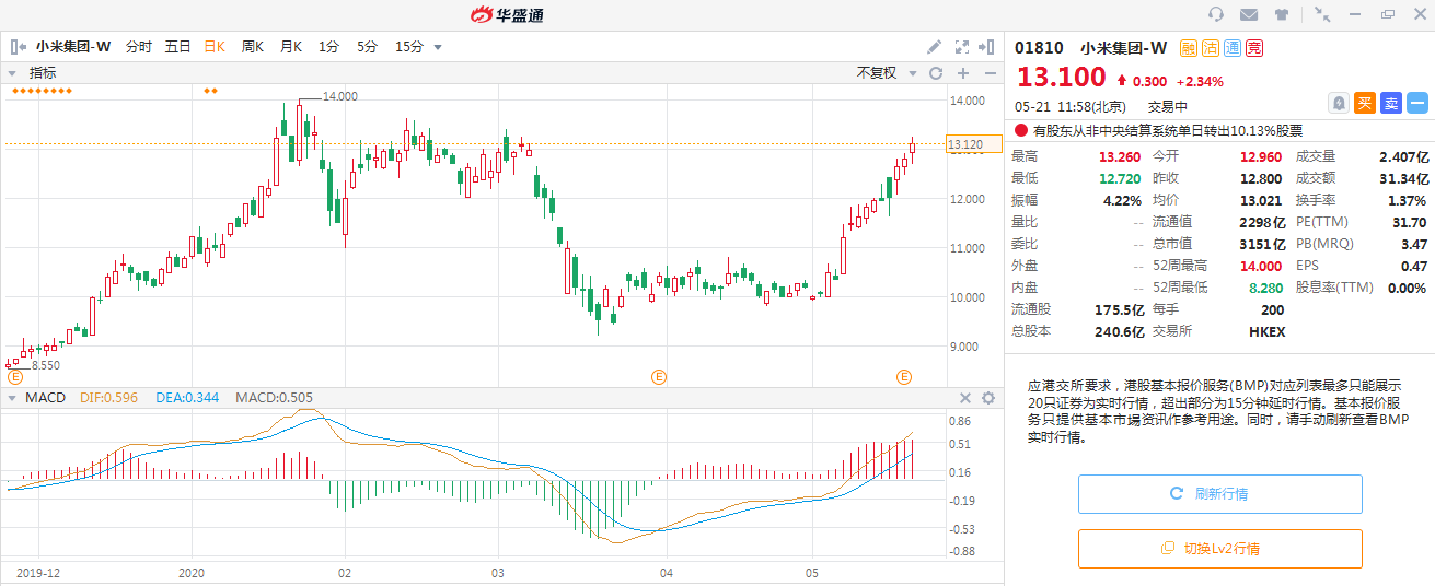 5月21日早盘,小米集团股价一度大涨超过2.6%,报13.14港元。迈入5月份,在一个月不到的时间小米已经实现了最大涨幅超过30%,市值重新站上3000亿港元上方。