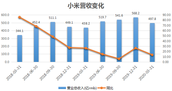 5月20日晚间,小米集团公布2020年第一季度财报,其营收497.02亿元,同比增长13.6%,环比下降12%,主要由于IOT(物联网和生活消费品)业务受到国内疫情影响环比降幅比较明显,但还是高出彭博一致预期的480亿约2.5%。