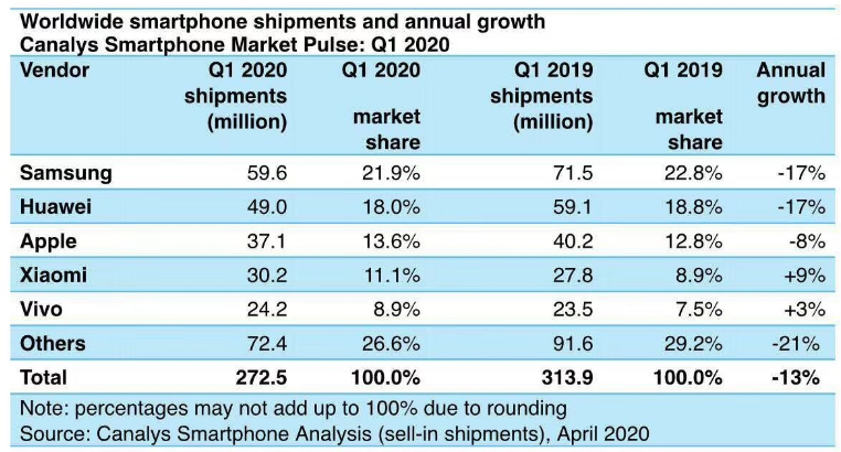 知名数据统计机构Canalys发布的2020年第一季度全球智能手机市场统计中显示,由于全球智能手机市场萎缩,叠加新冠疫情影响,2020年第一季度全球智能手机市场出货2.72亿部,同比2019年第一季度的3.13亿部下滑13%。