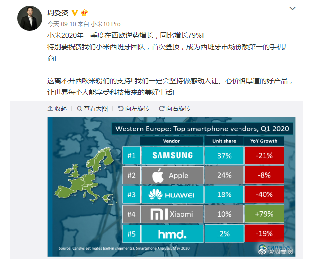 此前小米国际部总裁周受资援引的Canalys数据显示,第一季度,小米在西欧智能手机市场出货量同比增长79%,市场份额达到10%,也是该市场份额前五的品牌中唯一取得同比正增长的。