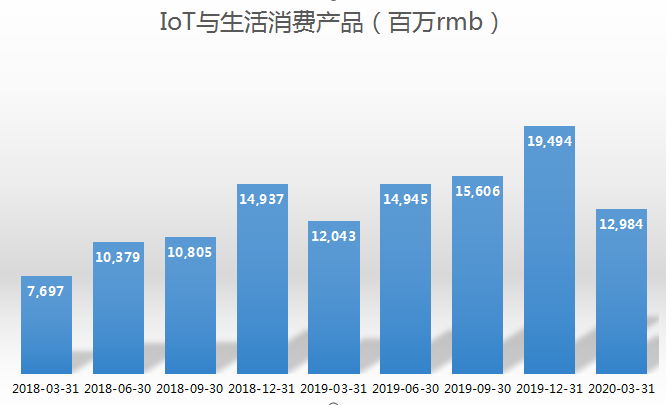 2020年一季度,消费品行业受到疫情重挫,白电、电视等生产、运输、销售均受疫情影响,但由于小米IoT品类多样性及坚实的业务基础,IoT与生活消费品业务仍保持增长,2020年Q1收入达人民币130亿元,同比增长7.8%。
