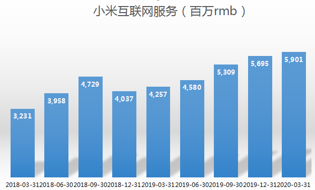 2020年一季度,小米互联网业务整体表现出色,互联网服务收入人民币59亿元,同比增长38.6%,占总体收入比持续上升,突破10%,达到11.9%。
