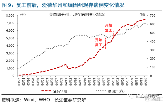 美国目前整体疫情形势依然严峻,多个州的疫情状况在快速复工后显著恶化。 4月中旬以来,美国现存病例从61.6万例大幅增加至109万例,新增确诊病例持续围绕2.5万例/天上下波动;州层面,有超过一半的州,疫情仍处于爬坡期或平台期。快速复工后,美国多个州的疫情形势显著恶化。其中,疫情在复工前有所好转的德克萨斯州、阿拉巴马州等,新增确诊病例自复工起大幅攀升。