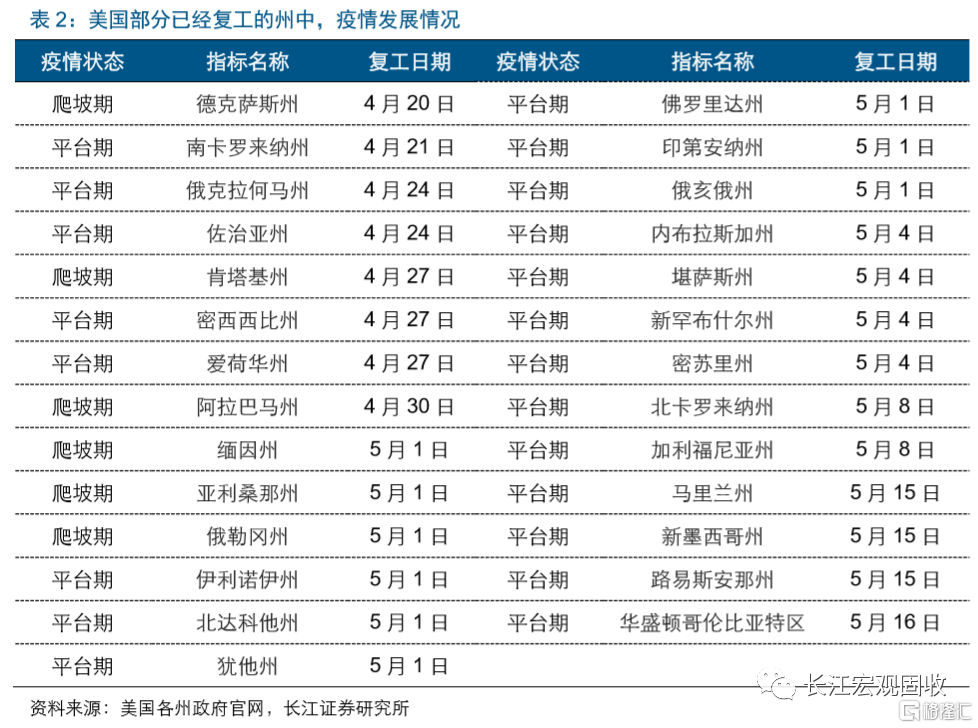 4月中旬以来,美国和德国、西班牙、意大利、法国、荷兰、英国等陆续公布复工计划,推动经济重启。4月17日,美国联邦政府公布复工指引,建议分3阶段恢复工厂生产,以及开放餐馆、电影院、教堂等公共场所。4月20日起,以德国为首的欧盟国家,也开始推动经济重启。其中,德国、波兰在4月20日率先开启第一阶段复工,西班牙、意大利、葡萄牙、希腊等将复工日期定于5月2日至4日之间;同时,法国、比利时、荷兰、英国等,陆续从5月11日起进入复工状态。