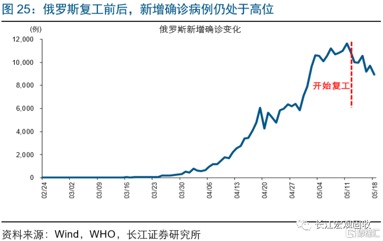 新兴经济体方面,俄罗斯、土耳其,双双“带病”复工;伊朗在复工后,疫情出现大幅反弹。虽然日均新增确诊病例依然超过8000例/天,但俄罗斯在5月12日宣布“带病”复工,推进建筑业、农业等复工复产。与俄罗斯相似,土耳其在疫情未收尾之际,于5月12日宣布所有主要工厂恢复生产。伊朗开始复工的时间较早,从4月18日起允许低风险行业恢复运营。但因防控措施不严等,伊朗疫情在5月以来出现大幅反弹,新增确诊病例由1000例/天以下快速攀升至2000例/天以上。