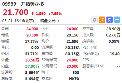 华盛资讯5月21日讯,创新药企开拓药业-B(09939-HK)暗盘高开19%,一手账面盈利1925港元,截至16:16报价21.7港元,涨幅7.69%。最新成交额627万港元,总市值为80.15亿港元。