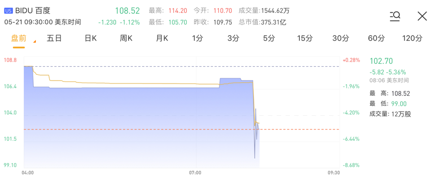华盛资讯5月21日讯,李彦宏称正考虑在香港二次上市,百度(BIDU)盘前一度跌超8%。截至发稿,百度盘前股价跌5.36%,报102.7美元,成交量为12万股。