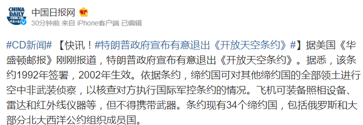中国日报网微博5月21日援引外媒报道,特朗普政府宣布有意退出《开放天空条约》。据悉,该条约1992年签署,2002年生效。依据条约,缔约国可对其他缔约国的全部领土进行空中非武装侦察,以核查对方执行国际军控条约的情况。飞机可装备照相设备、雷达和红外线仪器等,但不得携带武器。条约现有34个缔约国,包括俄罗斯和大部分北大西洋公约组织成员国。