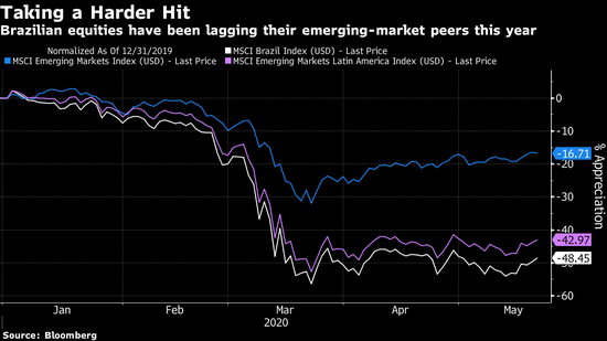 以美元计价的巴西股市今年下跌逾48%。高盛策略师Kamakshya Trivedi在5月20日的一份报告中写道,巴西股市将受益于风险资产需求的增长以及2020年下半年大宗商品价格的反弹。