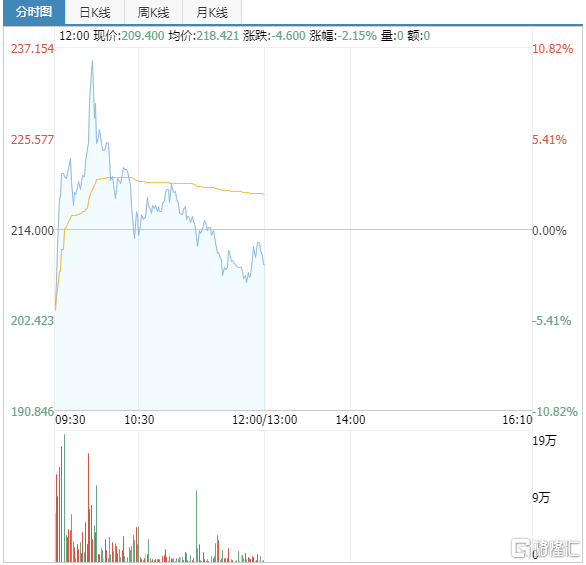 康希诺生物也不能幸免,股价209.40港元,跌幅2.15%。
