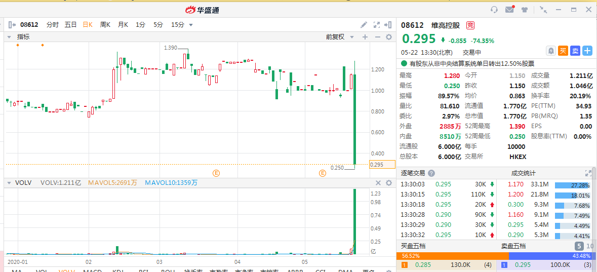 新浪港股讯 5月22日消息,港股维亮控股午后闪崩,跌近80%,目前跌幅收窄至74%。