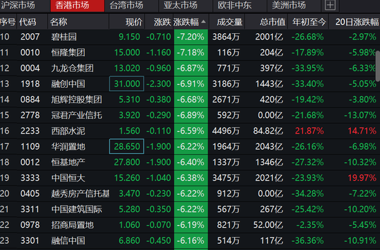 新浪港股讯 5月22日消息,香港本地地产股信和置业、太古、新世界、九仓等暴跌10%,内房股跌幅也不断扩大。其中,碧桂园大跌7.2%,融创中国跌6.9%,旭辉控股跌6.7%,华润置地跌6.2%,中国恒大跌6.4%,融信中国跌6%,新城发展、禹洲地产、雅居乐、时代控股、建业地产、SOHO中国等跌超4%。万科、世茂等跌超3%。