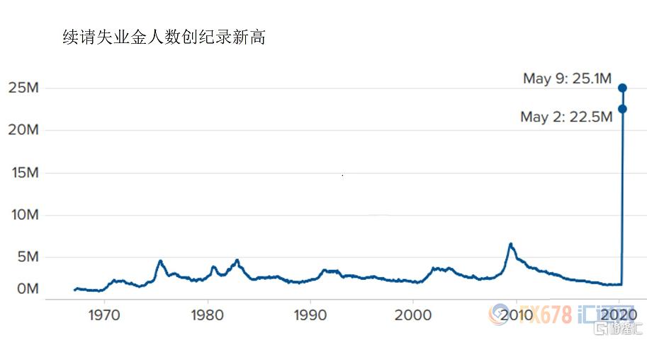 截至5月16日当周初请失业金人数总计240万,自3月底以来的总申请人数达到3860万。截至5月9日当周,续请失业金人数上升至2510万人,较前一周增加250万人。
