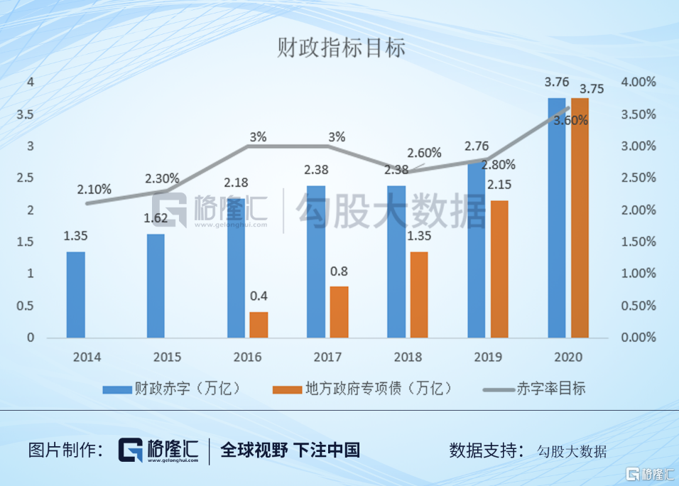 在这一定调下,今年的赤字率政府提高到了3.6%,是过去数年来最高,财政赤字规模提高到3.76万亿,比2019年还增加了1万亿。除此之外,还有地方政府专项债3.75万亿,比去年同期增加了1.6万亿。