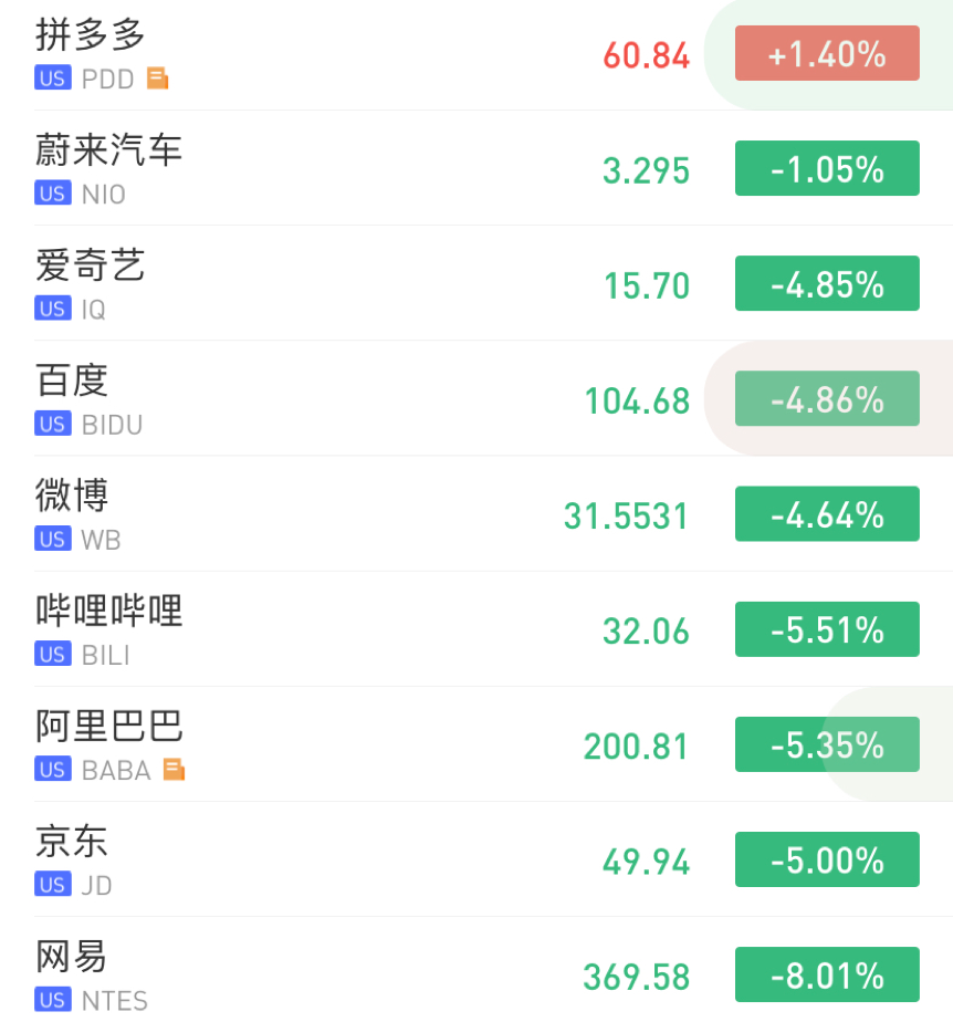 华盛资讯5月22日讯,受法案利空影响,热门中概再度暴跌,仅拼多多受财报提振顽强翻红。截至发稿,热门中概中仅拼多多涨1.4%,阿里、京东均跌超5%,网易跌超8%。