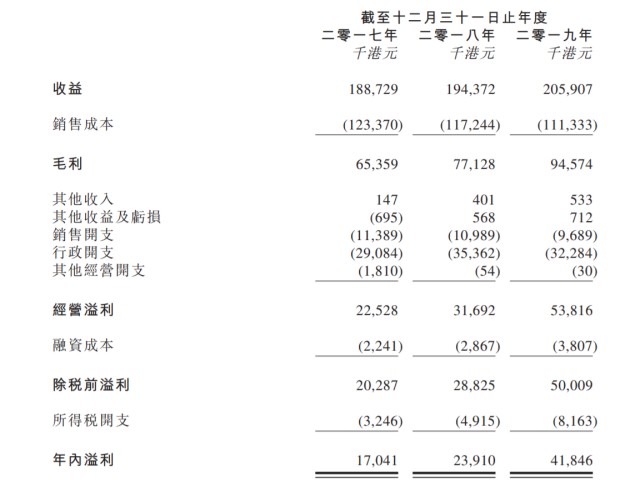 2017-2019财政年度,公司收入分别约为1.89亿港元,1.94亿港元,2.06亿港元。公司称,公司2017-2018财政年度收入上升约3%主要是由于2017-2018年价格普遍上调、材料等级较高的铝门窗及结构的销售额上升以及相关配件的销售额增加。2018-2019财政年度收入上升约5.9%主要是由于2019年新增主要客户(如客户K及客户L)、以更高等级的材料对新产 品供应进行改造带动收益增加及客户G对公司产品的需求增加所致。