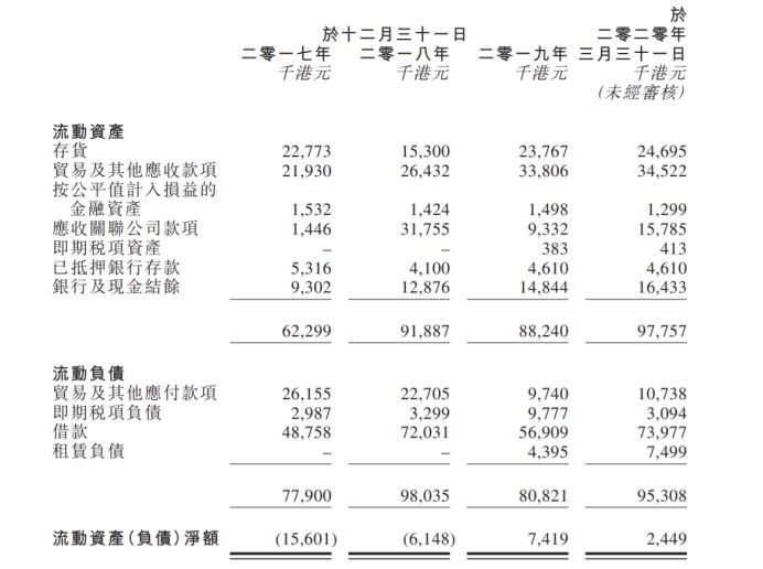 公司的流动资产净额由2019财政年度的约742万港元减少67.0%至2020年3月31日约240万港元,这主要由于公司借款增加。