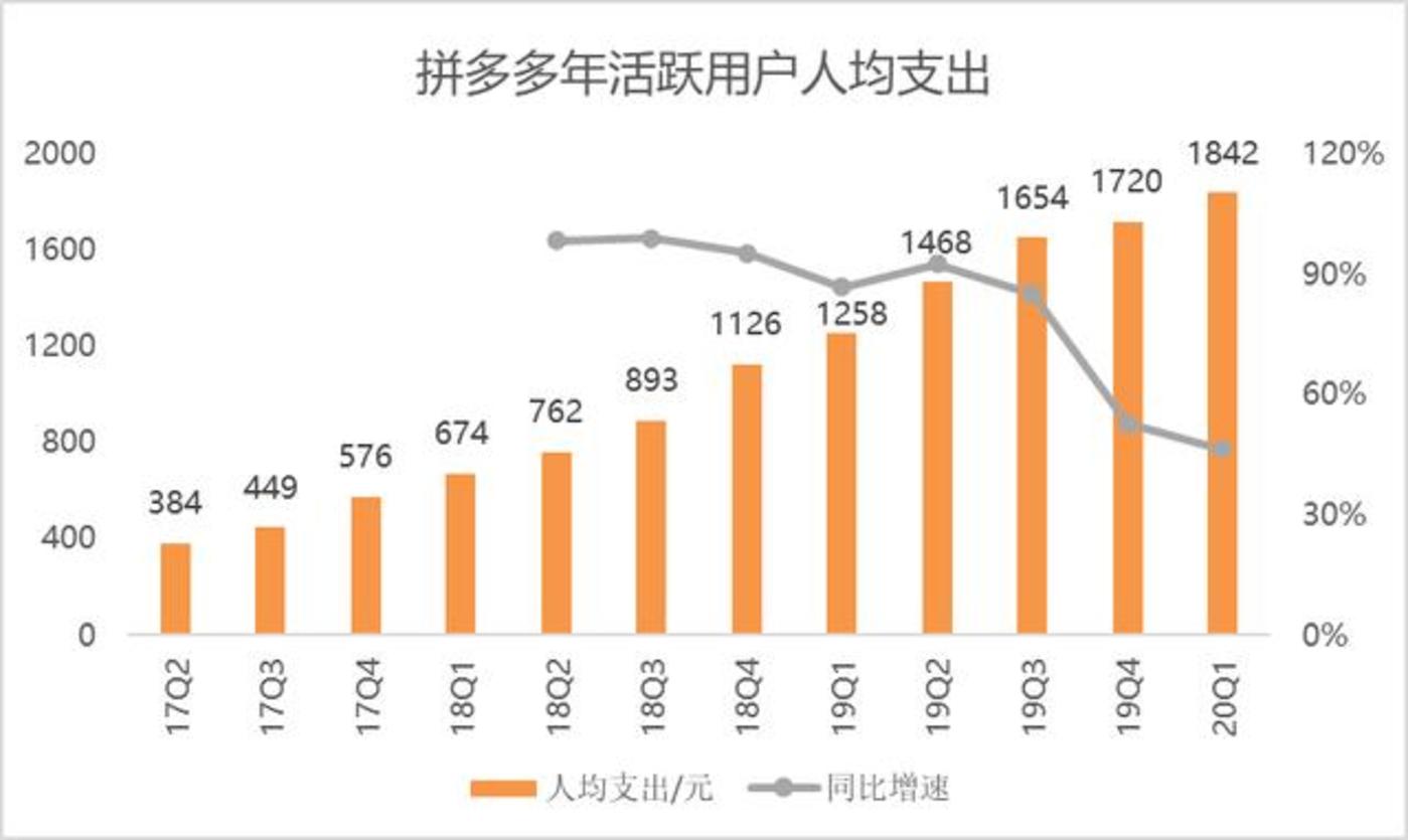 截至2020年一季末,拼多多活跃买家平均年度支出金额达到1842元,同比增长47%,2019年末,该数据为1720元。受益于买家数与人均支出齐升,拼多多过去12个月的GMV达到11572亿元,同比增长108%。根据推测,拼多多2020年第一季度的GMV为3026亿元,同比增幅达99%。