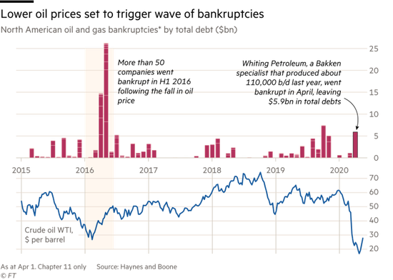 进入2020年,美国石油和天然气生产商受到投资者的冷落,并在沉重的债务负担下萎靡不振。俄罗斯和沙特的石油价格战之后,在疫情打击下,全球原油需求随之崩溃。油价暴跌,4月份,西得克萨斯中质原油期货(WTI)价格首次跌至负值。