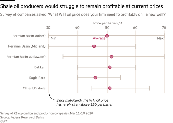 德克萨斯州和新墨西哥州的二叠纪盆地是世界上产量最高的页岩油田,但即便如此,平均而言,要想实现盈利,油价仍需要高于每桶45美元左右——比最近几天的价格高出近50%。