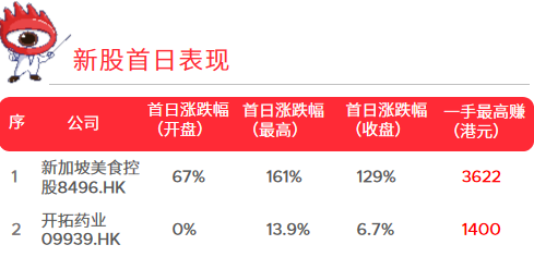 2、本周有2只新股上市,“套路拨”继续吃香!新加坡美食控股首日大涨160%,一手赚3622港元。周五行情不佳,板块受挫?开头药业照样大涨13.9%,一手赚1400港元。