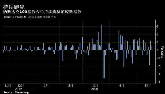 由于科技板块的崛起,这些差距变得格外限制。在不到半年的时间里,纳斯达克有17个交易日跑赢道琼斯指数一个百分点。彭博汇编的数据显示,这已经超过2009年以来的历年全年数字。