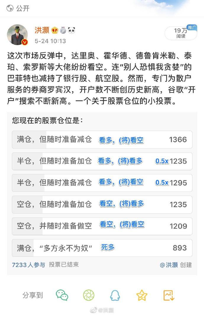 我今早发起了一个股票仓位调查。虽然票数看似均匀分布,多空胶着不下。然而,结果其实并非流于表象。我的设问分成两个部分:现在对股市的看法,和将来对股市的看法。比如,选项“满仓,但随时准备减仓”意味着现在看多(因为满仓),但是将要看空。我把半仓也作为看多,但是只给0.5的权重(最后结果和注解如图)。因此: