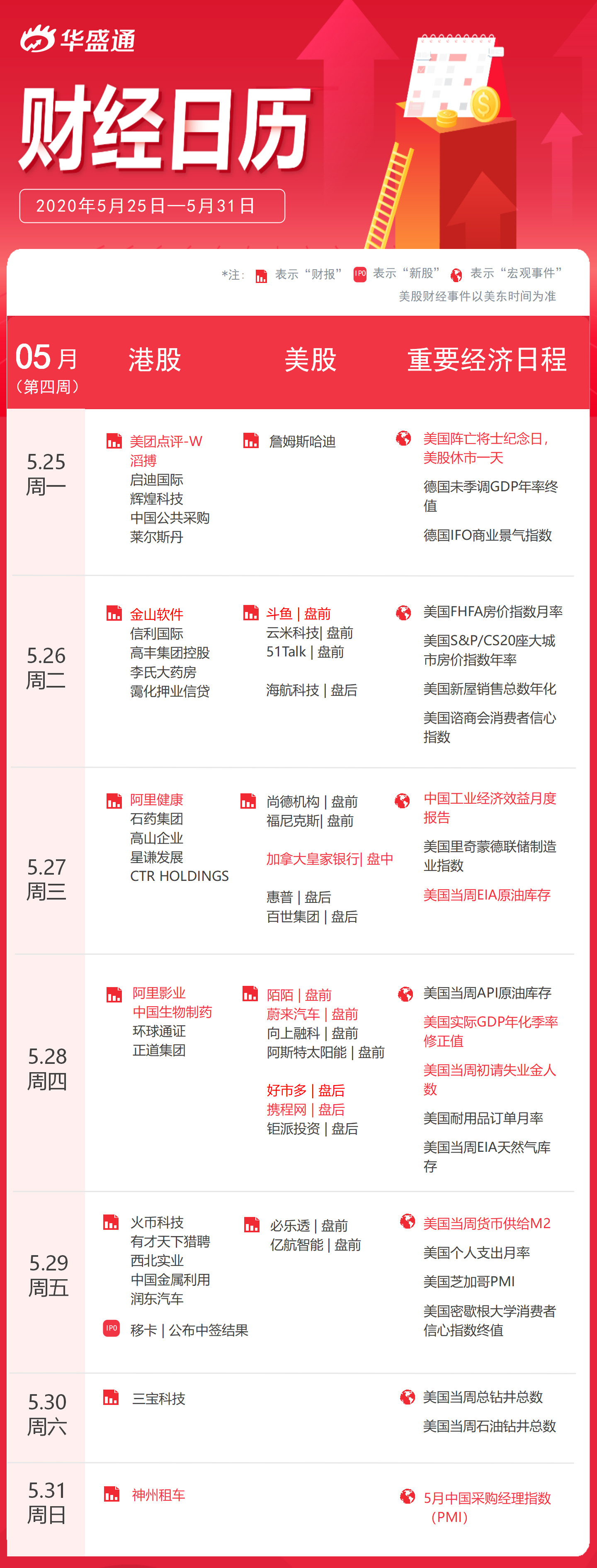 周一是美国阵亡将士纪念日,美股将休市一天。周三,中国国家统计局将公布中国工业经济效益月度报告。周四,美国将公布实际GDP年化季率修正值、当周初请失业金人数两项重磅数据,猜猜美国经济在疫情中的承受能力?周日,中国国家统计局将公布5月PMI数据,招商证券研究团队预测该指数交4月将有所下滑。