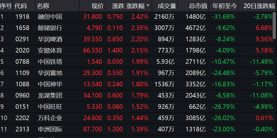 国企指数中只有7只股票下跌,融创中国、邮储、华润啤酒、安踏、中国铁塔等涨2%。