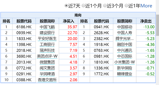 近7天资金流向方面,中国飞鹤流入36亿,建设银行流入23亿,平安好医生流入20亿,工商银行、瑞生结、微盟、美团、阅文、华润、港交所都获得大幅流入。不过,除了港交所全部为内地公司。