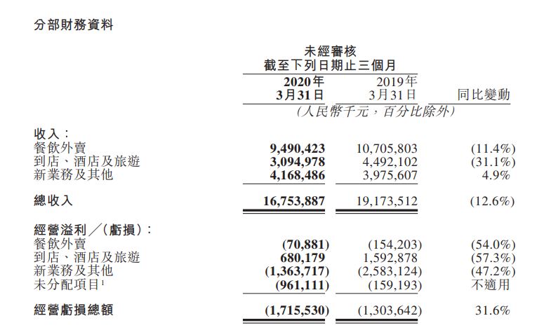 餐饮外卖业务于2020年第一季度录得经营亏损人民币70.9百万元,而2019年第四季度则录得经营溢利人民币482.8百万元,而经营利润率则由正值3.1%转为负值0.7%。