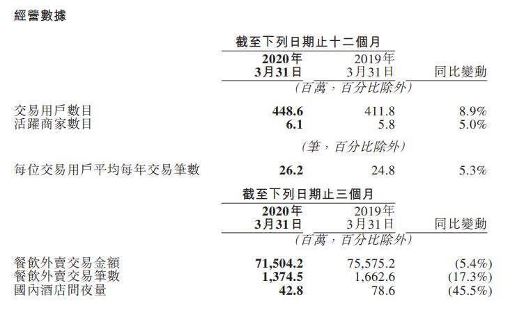 2020年第一季度,餐饮外卖业务的交易金额同比减少5.4%至人民币715亿元。餐饮外卖日均交易笔数同比减少18.2%至15.1百万笔。每笔餐饮外卖业务订单的平均价值同比增长14.4%。餐饮外卖业务的变现率2由2019年同期的14.2%降至13.3%。因此,于2020年第一季度,收入同比减少11.4%至人民币95亿元。