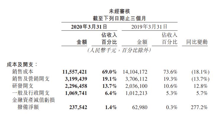 销售成本由去年同期的141亿元减少18.1%,至116亿元,占收入的百分比由73.6%减至69.0%。减少的主要原因是:疫情期间业务量减少,导致餐饮外卖骑手成本减少了15亿元,网约车司机相关成本减少5亿元;共享单车服务相关成本减少10亿元,主要是由于单车折旧大幅减少。