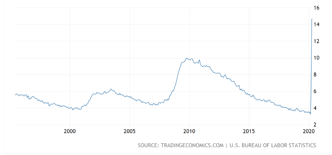新冠肺炎疫情对经济造成重创,失业率可能在5月、6月期间升至20%以上,其后再逐步回落。失业率数据可能因为技术原因而受到影响,但高于20%的情况很可能出现,到11月总统大选时可能仍然高于10%。
