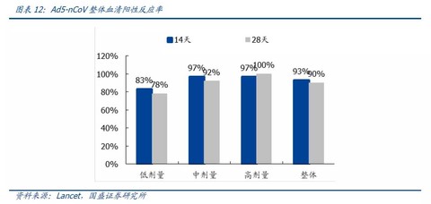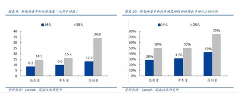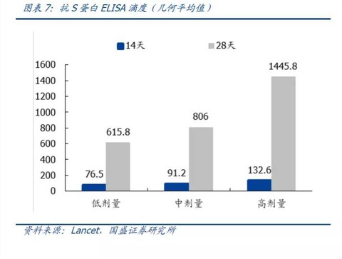 接种28天后,50%-70%志愿者体内的中和抗体滴度与注射前相比,增加了4倍以上,并且高剂量组中增加4倍以上的比例为75%,明显高于低、中剂量组的50%。