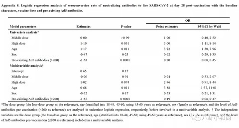多变量分析显示,无论疫苗剂量如何,45-60岁的受试者与年轻受试者相比,中和抗体的血清转化率似乎较低。在本研究中没有一人在60岁以上,只有16%在50岁以上,所以疫苗能否在老年群体中产生强效的细胞免疫和体液免疫的信息有限。