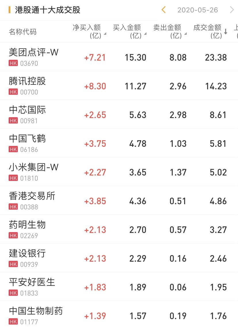 港股通今日净买入腾讯8.3亿港元,美团点评7.21亿港元,中国飞鹤3.75亿港元,中芯国际2.65亿港元。