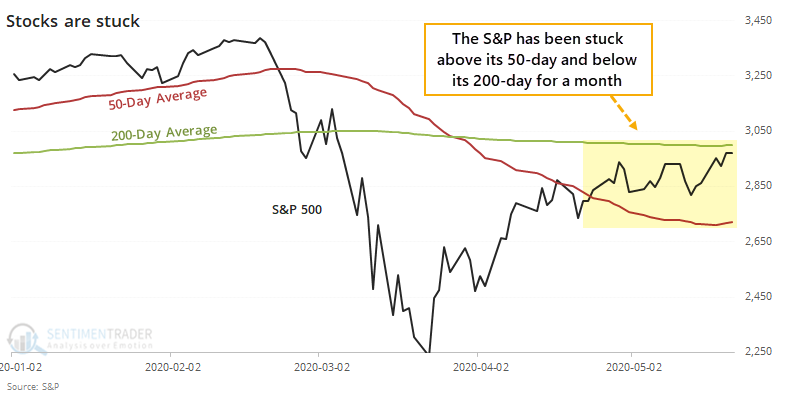 与此同时,该指标仍高于50日移动均线,这是交易员用来衡量资产短期趋势的指标。换句话说,股市“被困在时间框架之间”,投资研究公司Sundial Capital research的创始人、SentimenTrader 主管Jason Goepfert在上周五的一份报告中写道(见下图)。截至上周五收盘,该指数连续21个交易日保持在50日和200日均线之间。