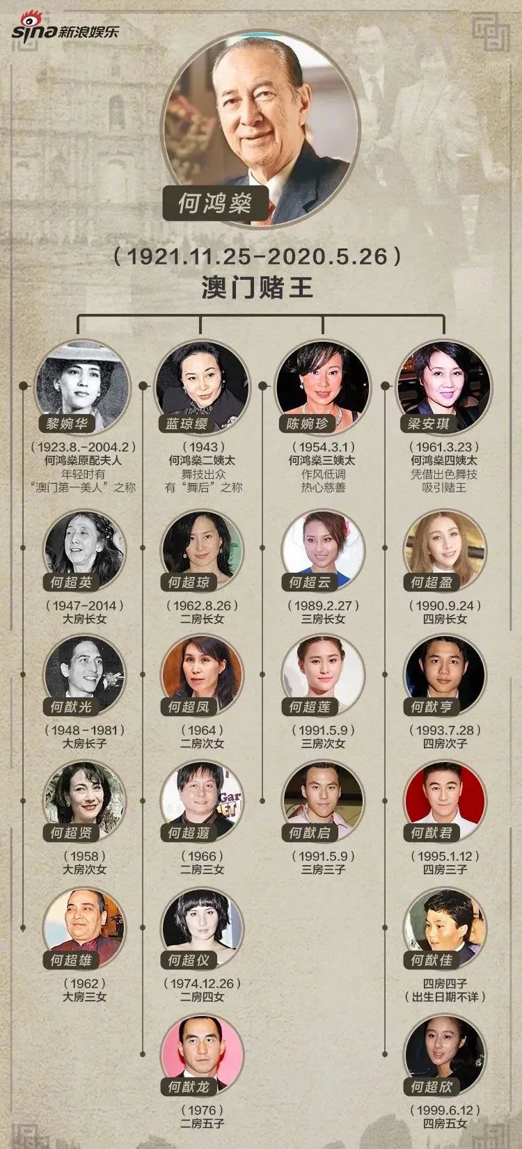 何鸿燊一共有4房太太和17个子女。原配太太黎婉华在儿子何猷光车祸去世后身体一直不好,于2004年病逝。二房太太蓝琼缨在黎婉华卧床生病时入门,主要陪同何鸿燊出席各类商业活动和应酬,因为出众的舞姿,与何鸿燊被当时媒体称为“舞后”和“舞帝”。三房太太曾是黎婉华的私人看护。1986年,何鸿燊在舞会上认识了当时担任舞蹈教师的梁安琪,从此拥有了4房妻室。
