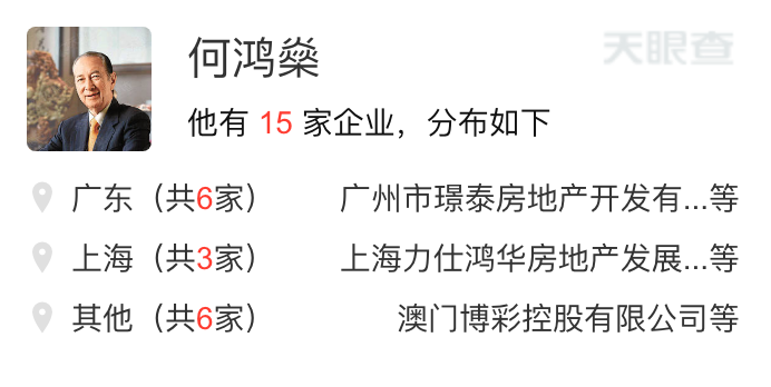 天眼查数据显示,何鸿燊名下共有15家企业,其妻子梁安琪担任7家企业法定代表人。从其关联企业的行业分布来看,房地产行业数量最多,注册资本主要集中在1000万~5000万元和5000万元以上。