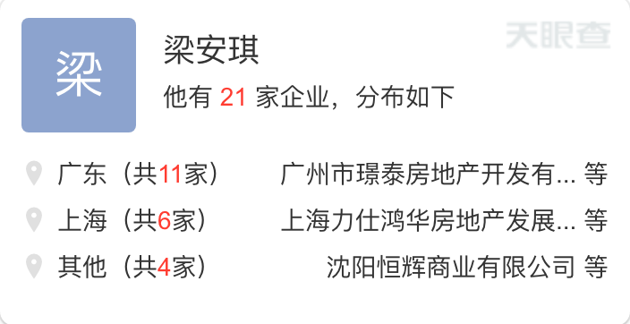 梁安琪名下共有21家企业,目前有1家是注销状态。从其关联企业的行业分布来看,房地产行业数量同样是最多的,注册资本主要集中在5000万元以上,其次为1000万~5000万元和100万~500万元。