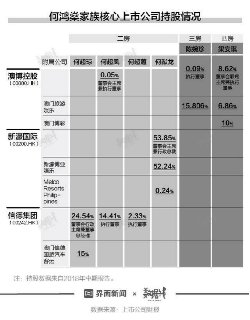 其中澳博控股除了四房梁安琪在三层架构都有持股外,三房陈婉珍、何超琼等家族成员大多只在澳娱有持股。