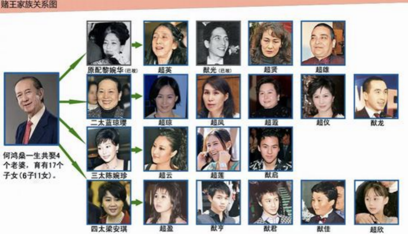 赌王一生风流,合共娶了4个老婆,育有6子11女。表面热闹的豪门家族,实际上充满了明争暗斗。
