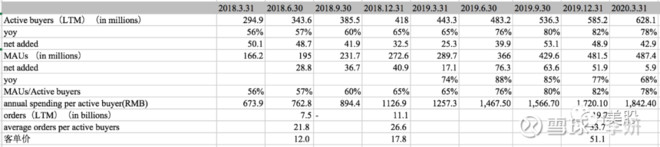 d)Annual spending per active buyer。最能说明问题的是用户年均花费的增长,在活跃买家数不断增长,拉低用户年均消费额的情况下(新用户花的钱往往较少),拼多多用户的平均花费已提升至1842.4元,说明老用户在平台的消费额增长更高。