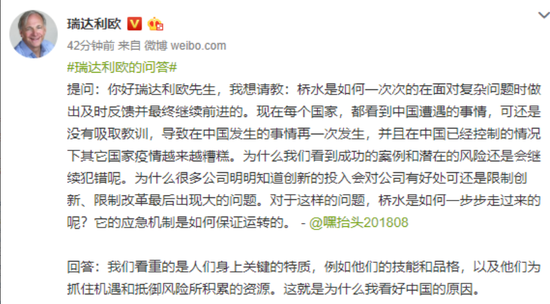 在回答粉丝关于“桥水是如何针对复杂问题做出反馈”提问时,桥水创始人达利欧表示,他较为看重的是人们身上关键的特质,例如技能和品格,以及人们为抓住机遇和抵御风险所积累的资源。这就是为什么看好中国的原因。